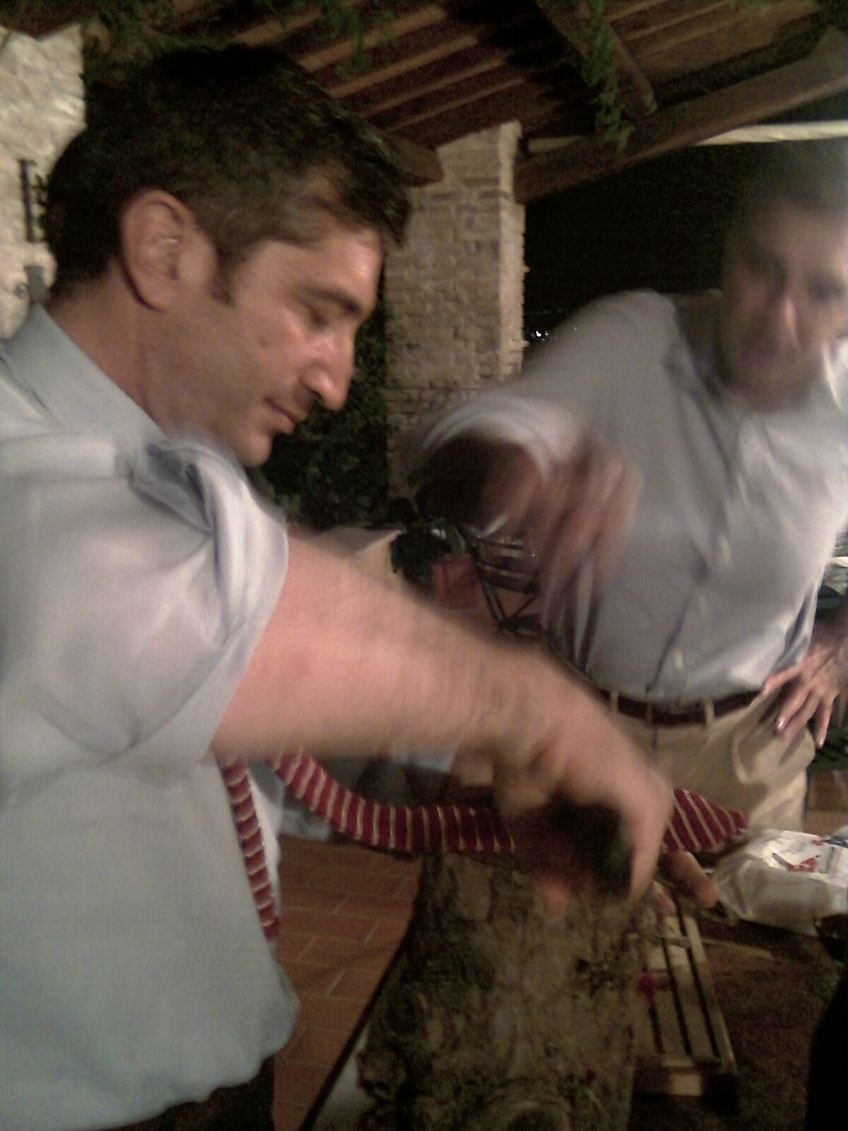 Prima di chiudere la cena con l’ottimo gelato procurato dal MT si svolgeva il rito apotropaico di decurtazione della cravatta sociale, decapitata sul ceppo con mano degna di un samurai dal Siniscalco, arbiter elegantiae e Mastro Procrastinatore. La cravatta così nobilmente riadattata sarà finalmente degna di essere sfoggiata nelle occasioni formali sino all’arrivo di più nobili accessori (contiamo che ciò avvenga prima del fatale impatto dell’asteroide sulla Terra nel 2036…). La serata si chiudeva tra lieti conversari, volute di fumo e degustazione dell’eccellente rum agricolo magnanimamente offerto dal Socio dell’Anno.
